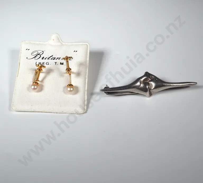 One Silver Brooch & a Pair of Gold coloured/Pearl Screw Earrings.
