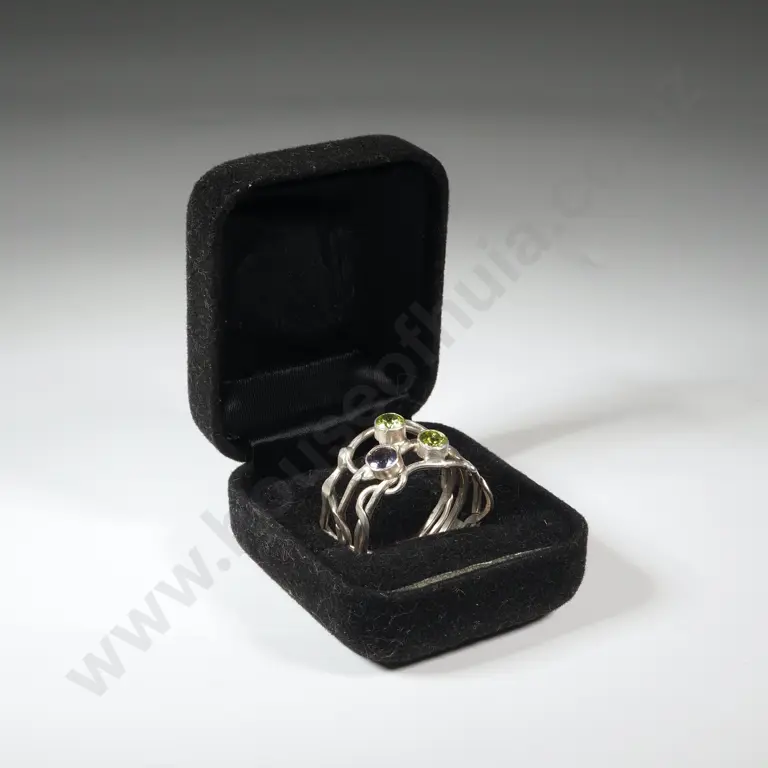 Sterling Silver Ring w Green/Mauve Gems & Lattice Band.