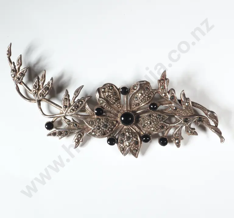 Sterling Silver & Marcasite Brooch In The Form Of A Flowering Branch With Black Cabochons