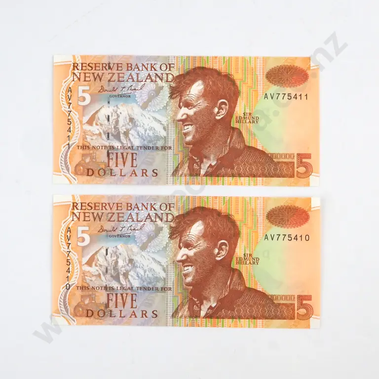 CONSECUTIVELY NUMBERED PAIR BRASH TYPE 2 SIGNATURE 1992, SERIALS AV775410 / 1 ( LAST PREFIX OF TYPE ), UNCIRCULATED, C.V. $120