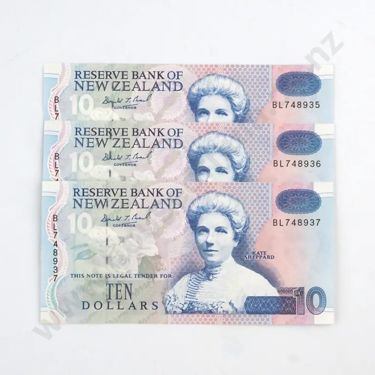 3 X CONSECUTIVELY NUMBERED BRASH SIGNATURE, SERIALS NXN 000235 / 6/ 7 ( LOW NUMBERS ) ( FIRST PREFIX OF SIGNATURE ), UNCIRCULATED, C.V. $100