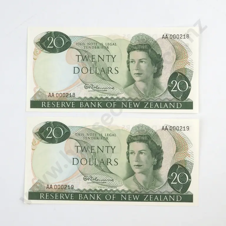 CONSECUTIVELY NUMBERED PAIR FLEMING SIGNATURE, SERIALS AA 000218 / 9 ( LOW NUMBERS ) ( FIRST PREFIX OF SIGNATURE ), UNCIRCULATED, C.V. $800