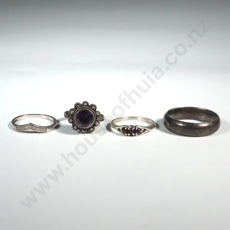 Four Sterling Silver Rings. One Set With an Circular Faceted Amethyst Estimate: $40 - $80