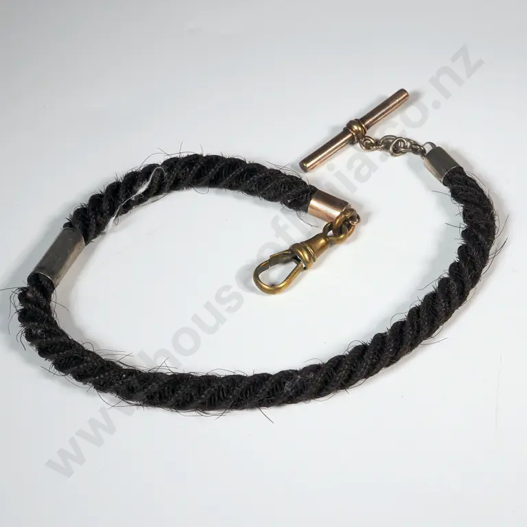 Victorian human hair fob chain with gold and silver mounts, brass dog clip
