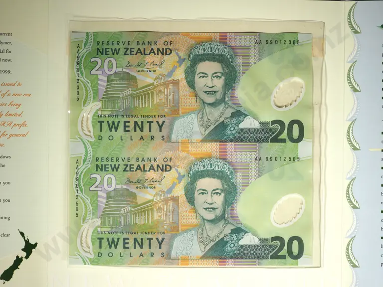 2 X CONSEC RESERVE BANK OF NEW ZEALAND TWENTY DOLLARS BRASH T III UNC