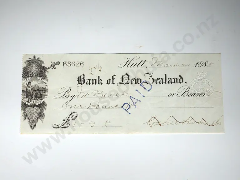 BANK OF NEW ZEALAND CHEQUE HUTT 1888