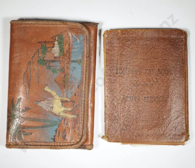 Egyptian Leather Wallet w WWII Paperwork & Dog Tag, & WWII Pay Book w Allied Military Bank Notes.