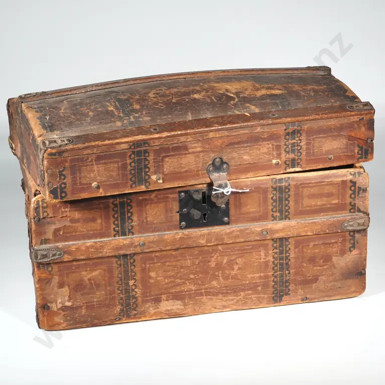 Small Wood Bound Dome Top Chest with Metal Lock & Hinges. A/F Possibly A Doll's Steamer Trunk
