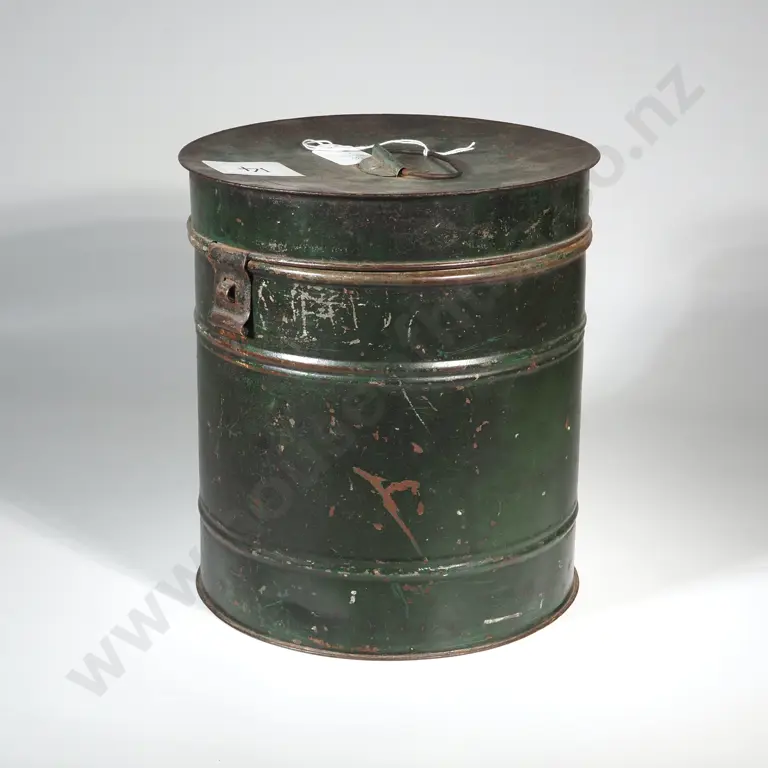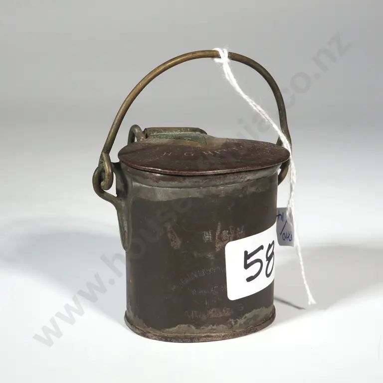 Antique Brass Lidded Canister w Handle. stamped "HGH Higginbotham & Co Makers 13a Arlise St.