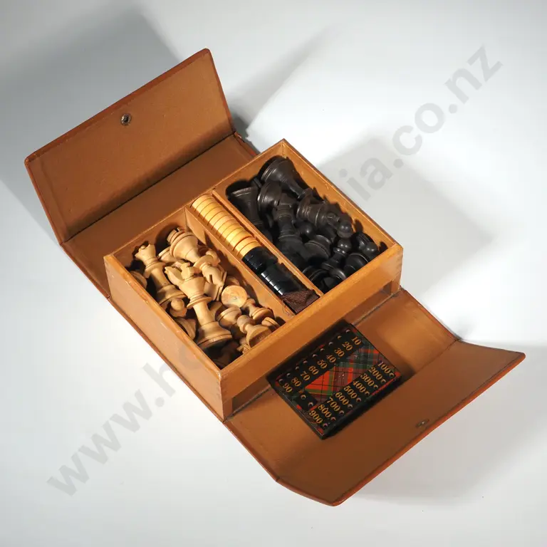 Case Containing Vintage Wooden Miniature Chess Set, Plastic Draught Counters & A Miniature Tartan Whist Board
