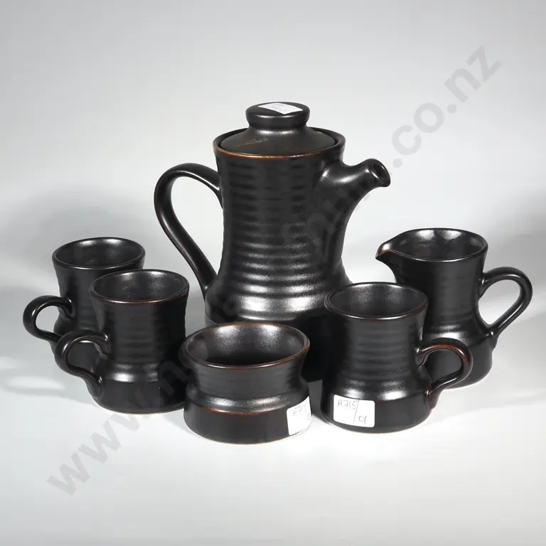 Dark Brown/Black Crown Lynn Pattern 1222 Coffee Set - Coffee Pot w Lid, Milk Jug, Sugar Bowl & Three Cups.
