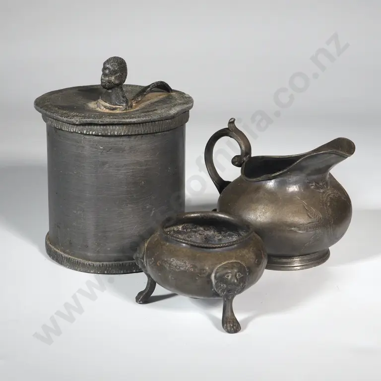 Small Metal Bowl w Three Lion's Head Feet & Pressed Pattern, Pressed Pattern Milk Jug, Weighted Lidded Canister.
