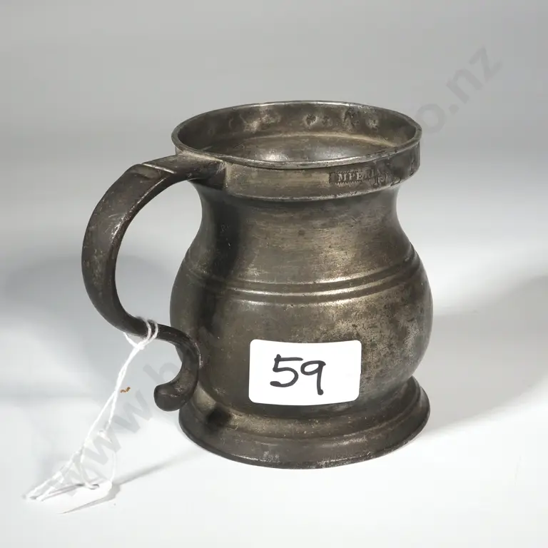 Antique Pewter Drinking Vessel Stamped 'Imperial 1/2 P.T. 100 No2 92 VR 44 1890 & Various Other Marks.