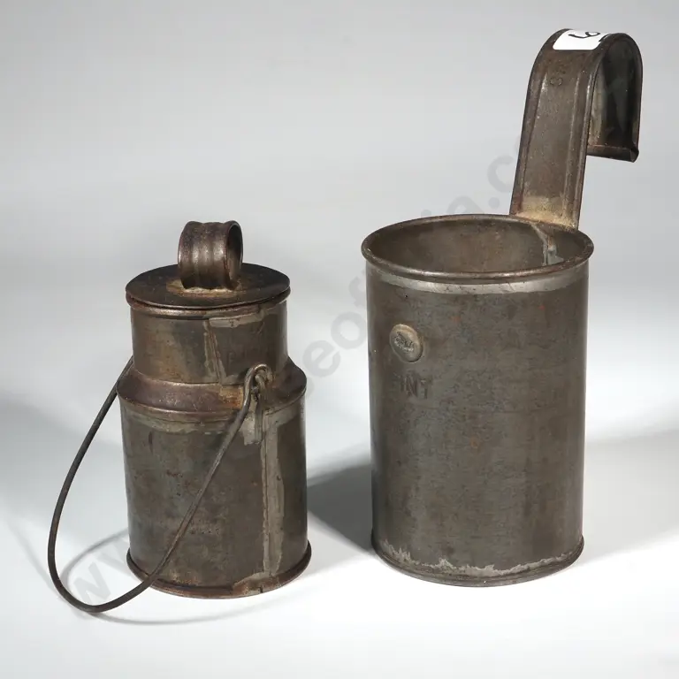 Tin Dairy Measuring Cup Stamped 'Pint CR 7144', & a Stamped 1/2 Pint Tin Milk/Cream Canister.