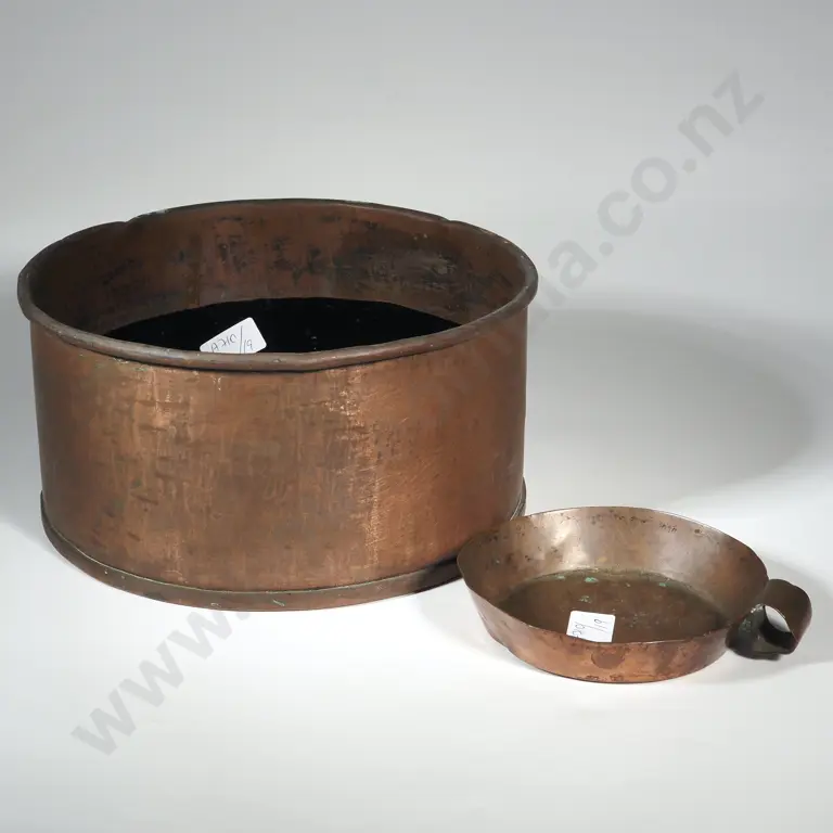 An Antique Weighted Cake Mould & Copper Candle Pan w Handle.