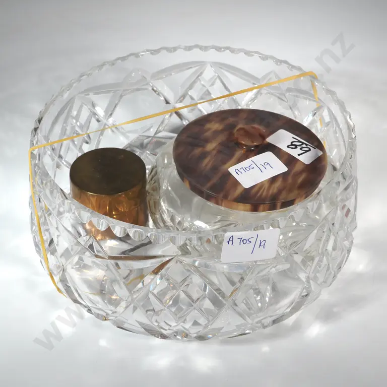 Large Glass Powder Bowl With Bakelite Lid,Cut Crystal Bowl & A Small Metal Container