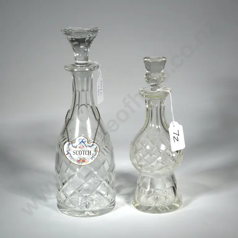 Two Crystal Decanters. The Smaller Thistle Shape with Thistle Stopper. the Larger with China Decanter Label "Scotch"