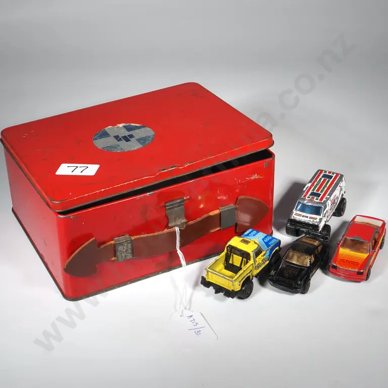 Vintage Red Tin Containing Four Matchbox Vehicles - 4 x 4 Chevy Van, Mercedes 500, Porche Turbo, Flareside Pick Up