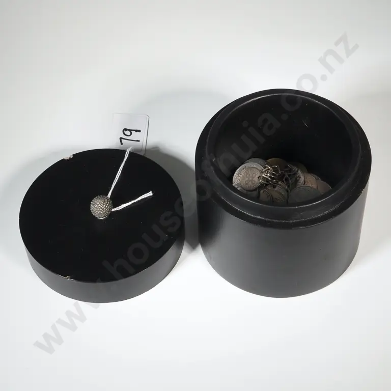 Circular Wooden Container Container & Collection Of Foreign Coins & An International Coin Bracelet