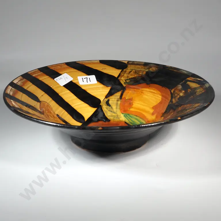 Large Pottery Bowl In Autumnal Colours Of Orange, Yellow, Green & Black. Signed AK To Base