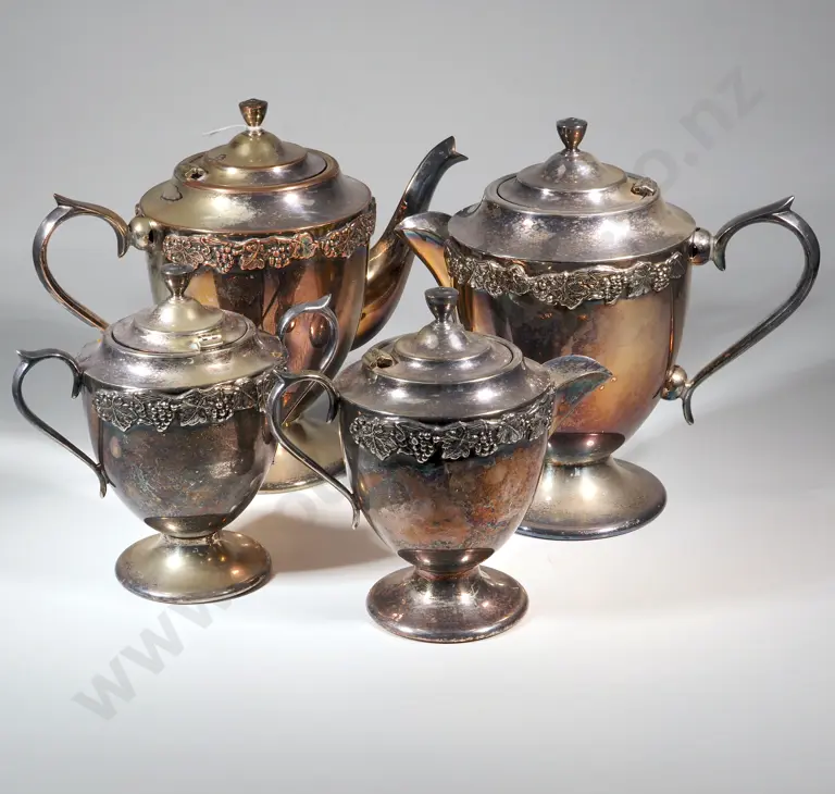Four Piece Silver Plated "Coronet" Tea Set with Applied Grape & Vine Decoration