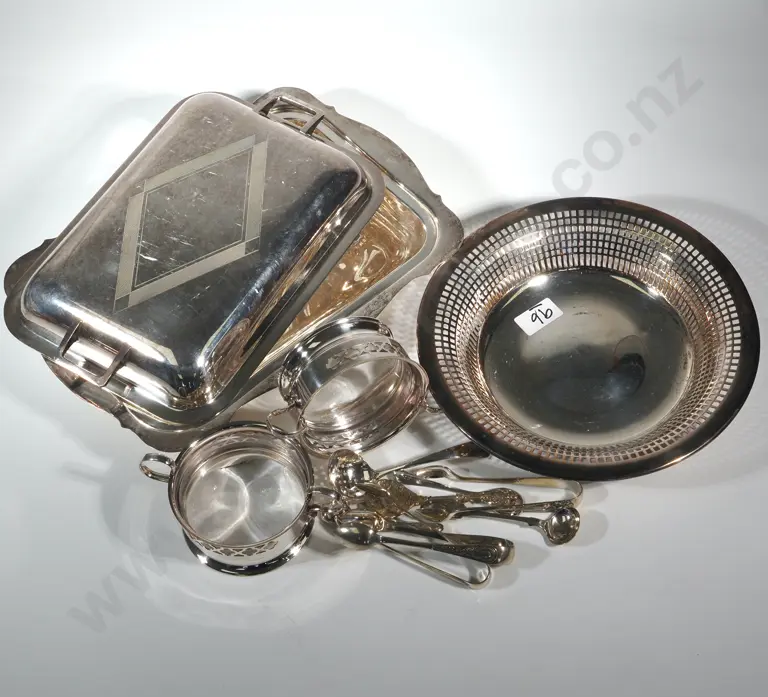 Silver Plate Entree Dish, Pierced Dish & Collection Of Small Flatware Items, Sugar Tongs, Mustard Spoon &