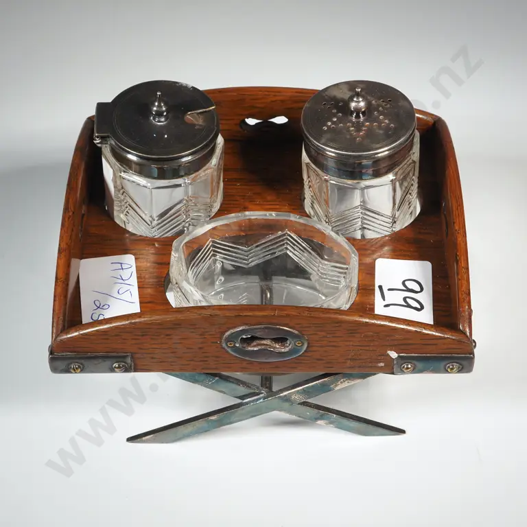 Oak & Silver Plate Butlers Tray & Stand Condiment Set.