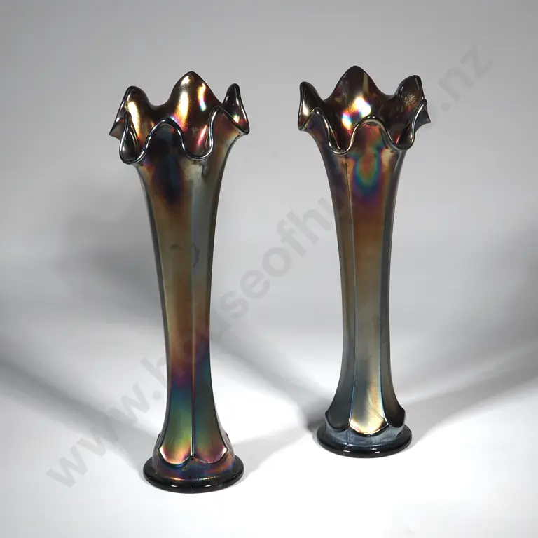 Pair Of Iridescence Purple Carnival Glass Vases with Faceted Sides & Frill Rim