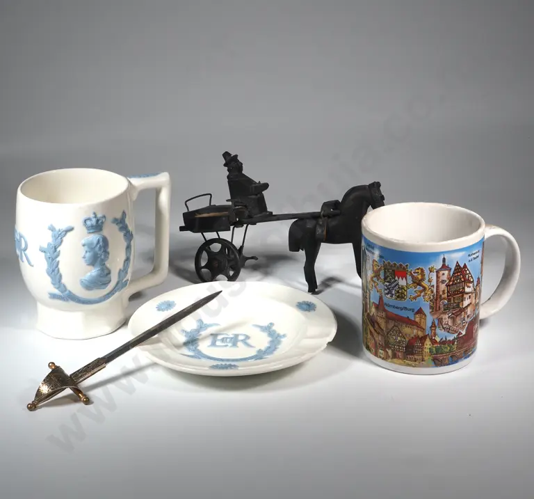 Wedgwood Coronation Queen Elizabeth II Mug & Ashtray, Souvenir Of Munich Musical Mug & A Folkart Horse Drawn Cart