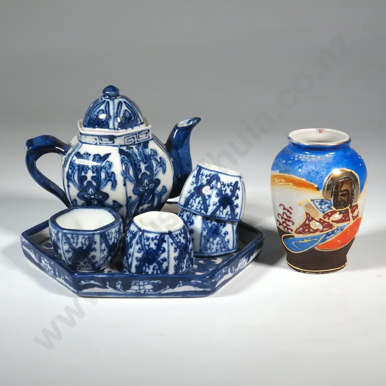 Miniature Blue & White Oriental Tea Set On Tray & A Small Vase