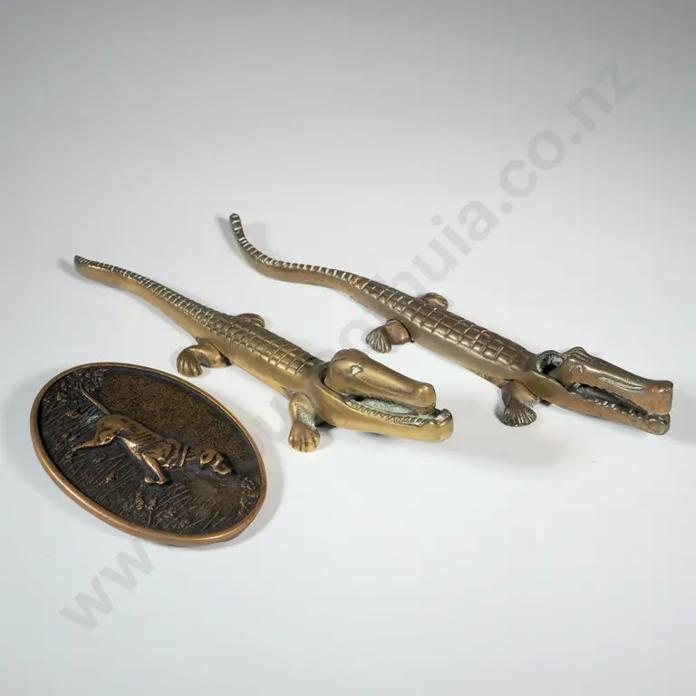 Two Small Crocodile Nut Crackers & An Oval Belt Buckle With Embossed Pointer In An Oval