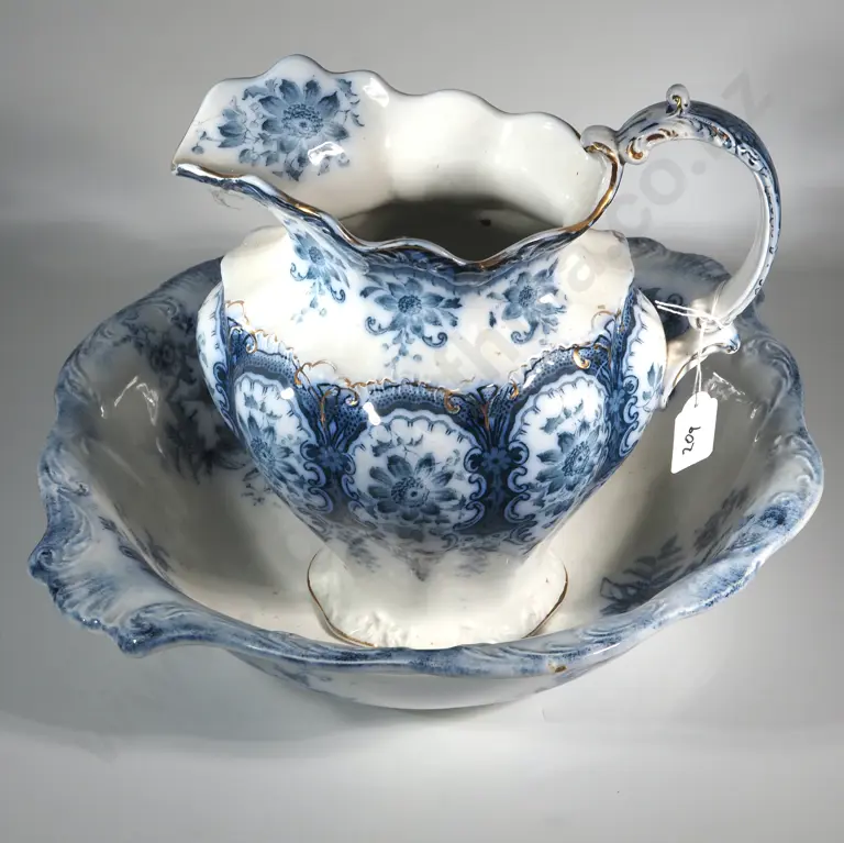 Antique Victorian Quality Blue And White Grindley & Sons Jug And Bowl Set In The "Clematis" Pattern