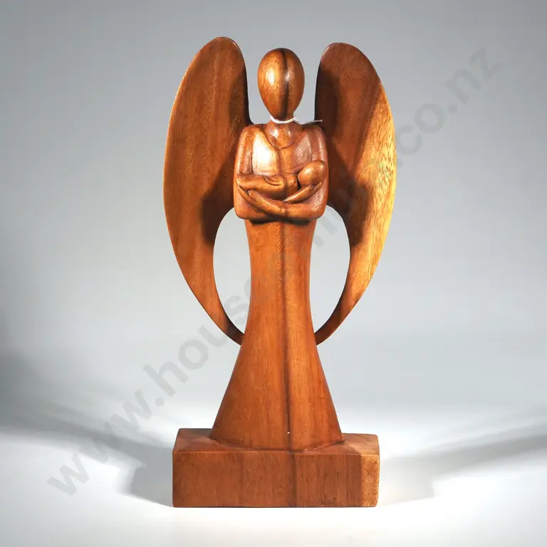 Hand Carved Wooden Sculpture Of A Guardian Angel Holding A Child. Probably Balinese