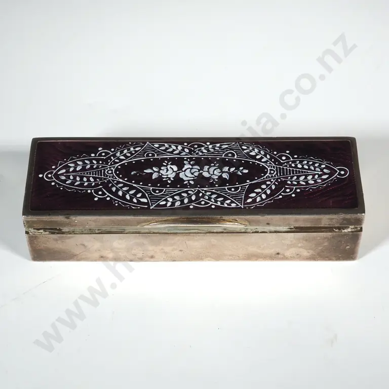 An Early 20th European Silver & Enamel Vanity Box. Rectangular Form With Purple Enamel & White Painted Decoration.