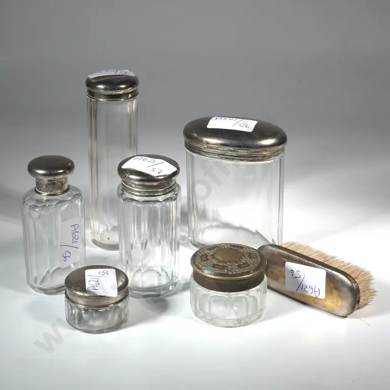 Set of Four Antique Ribbed Glass & Silver Coloured Topped Vanity Bottles, Jars and Small Clothes Brush.