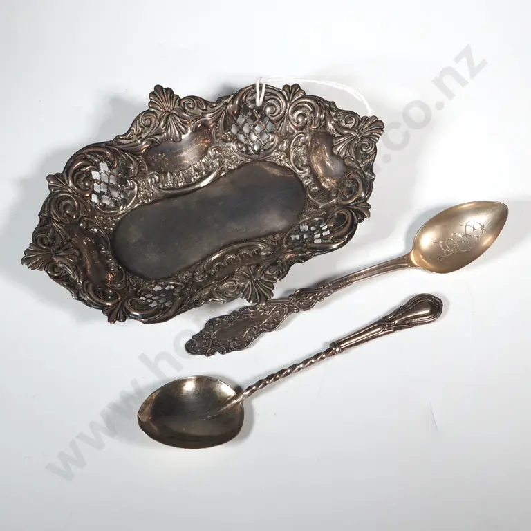 Sterling Silver Pierced Bon Bon Dish. Birm 1902 & Two Sterling Silver Teaspoons