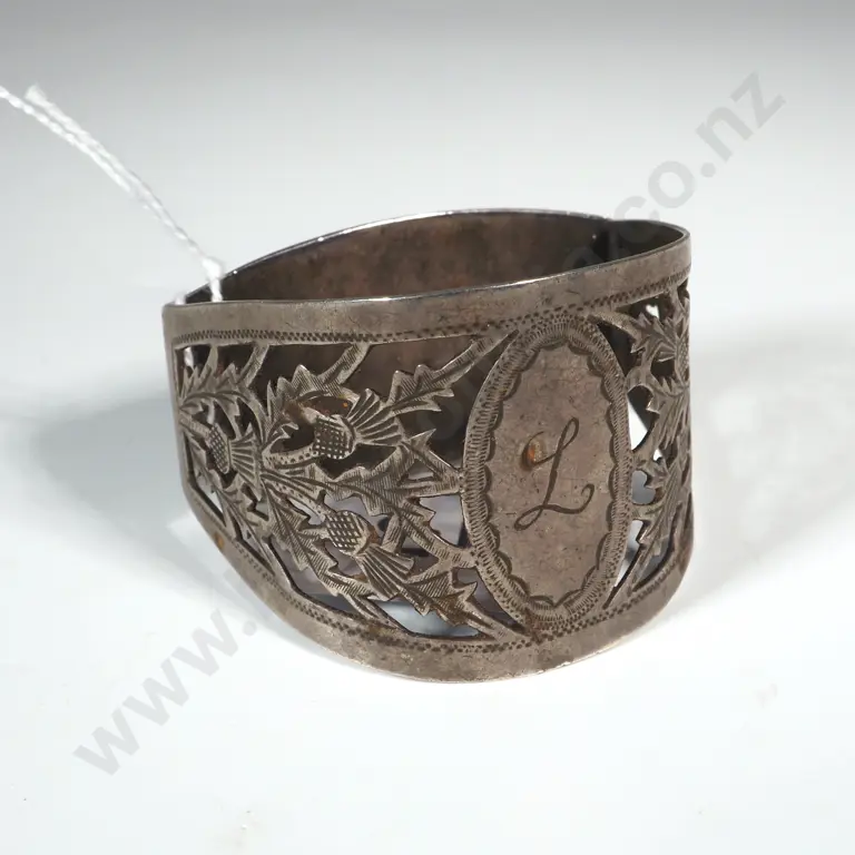 Sterling Silver Pierced Serviette Ring With Pierced Thistle Decoration. Initailled L