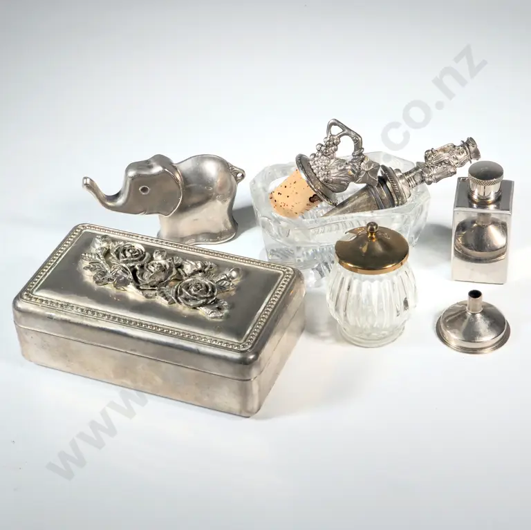 Collection of Metal Items To Include An Oblong Trinket Box with Embossed Roses, Two Bottle Stoppers. Stylised Elephant
