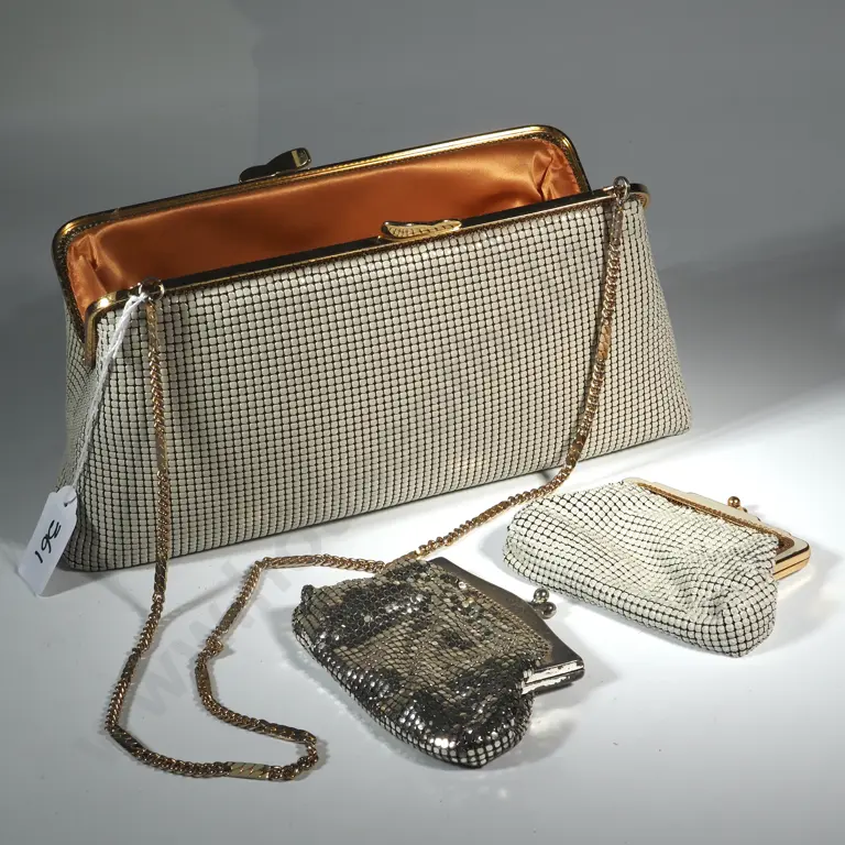 A Cream Mesh Oroton Style Clutch Purse w Chain & Change Purse, & an Oroton Style Silver Coloured Mesh Change Purse.