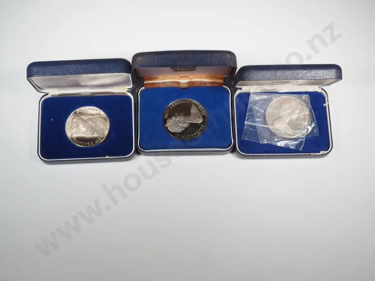 Three New Zealand Cased Proof Dollars & 1969 Cased Cook Commemorative Issue
