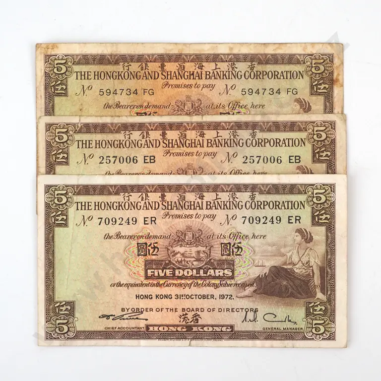 Three Hong Kong & Shanghai Banking Corporation Five Dollar Banknotes