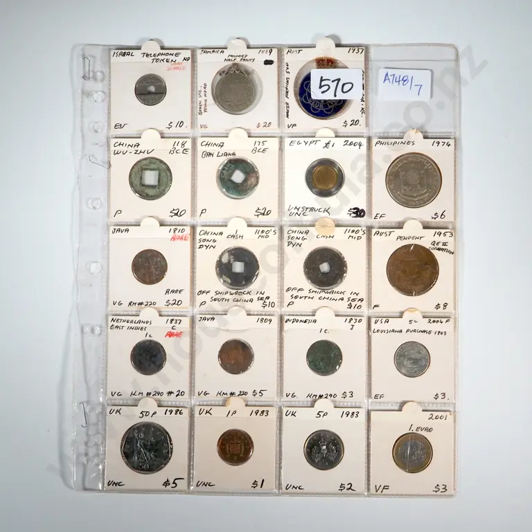 20 Carded Individual Coins & Tokens in Collectors Sheet