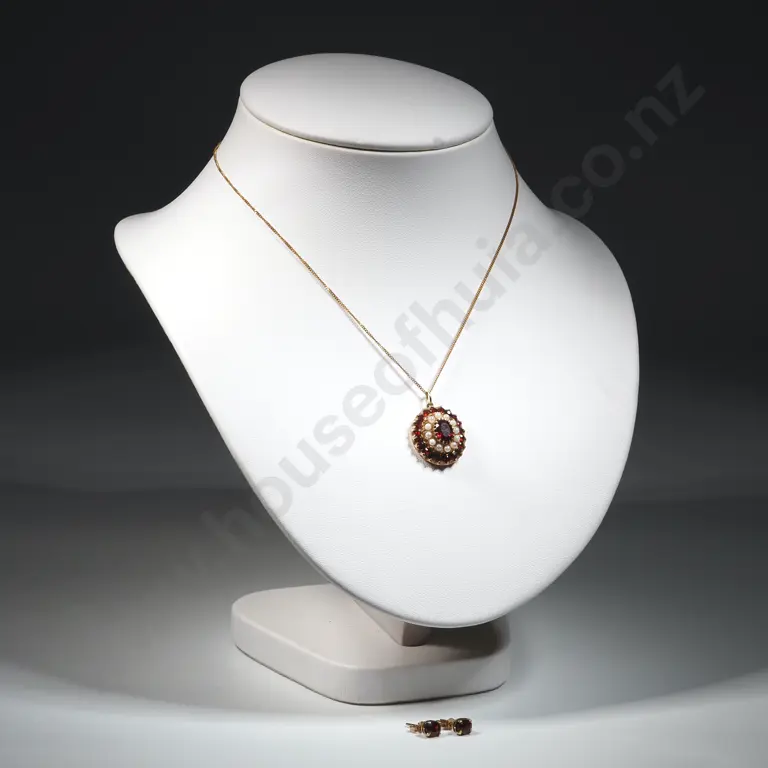 9ct Gold Garnet & Seed Pearl Cluster Pendant on 9ct Chain w/matching Stud Earrings