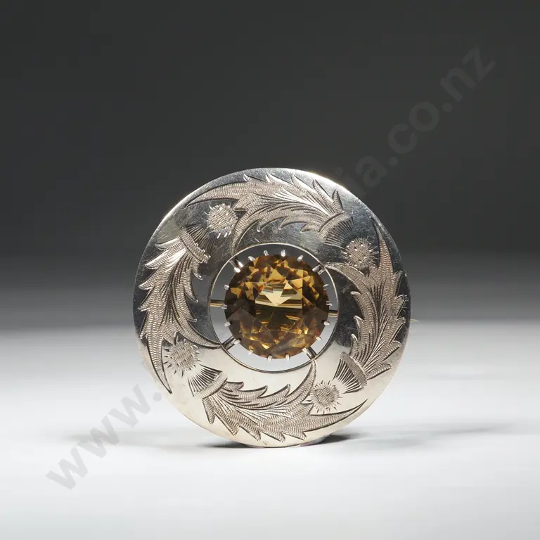 Scottish Brooch/Sash Pin With Central Citrine & Surrounded By Engraved Thistles