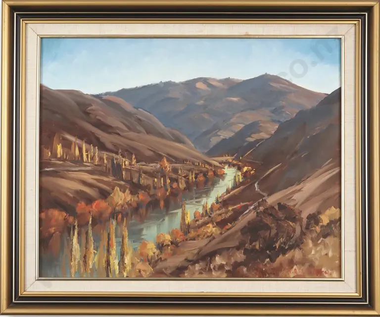 J A Rasmussen. Cromwell Gorge, Alexandra. Oil On Board.
