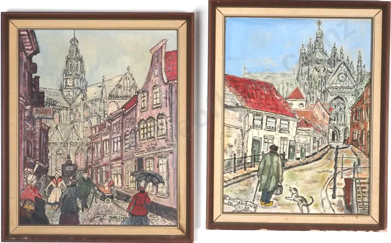 Framed Pair Of City Street w Cathedral Scenes, Netherlands. Oil On Board.