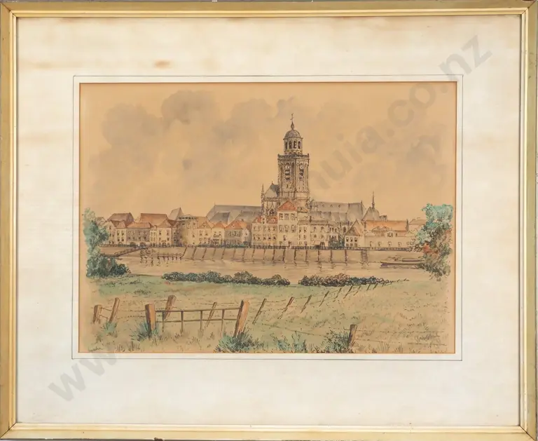 Strobel (Possibly). Architectural Depiction of a European City w Cathedral. Watercolour.