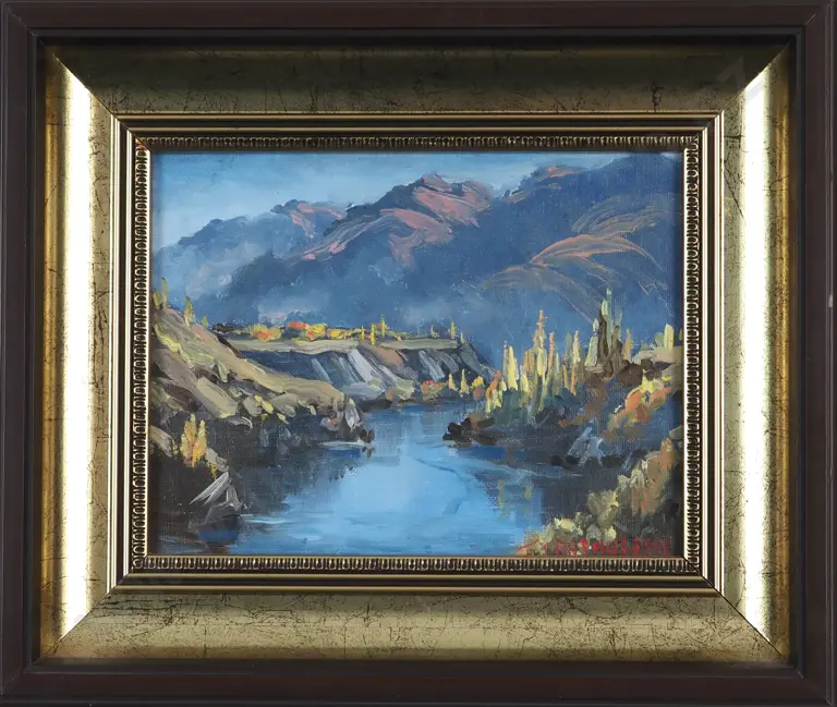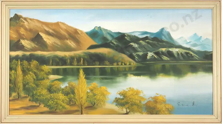 S. Manha (Possibly). Autumn Lake, Wanaka, Otago. Oil on Board.
