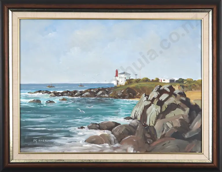P G Hall. Coastal Scene With Lighthouse. Oil On Board.