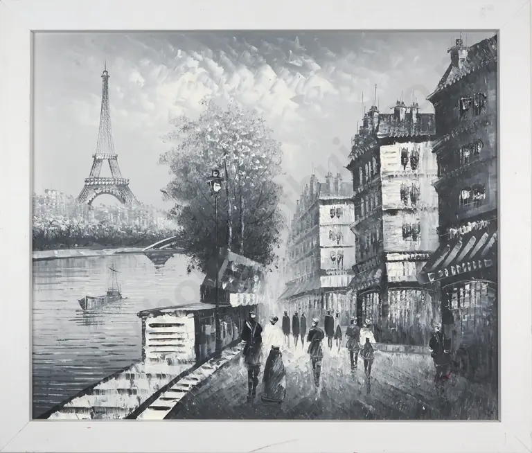 Riverside Walkway, Paris. Monochrome. Oil.